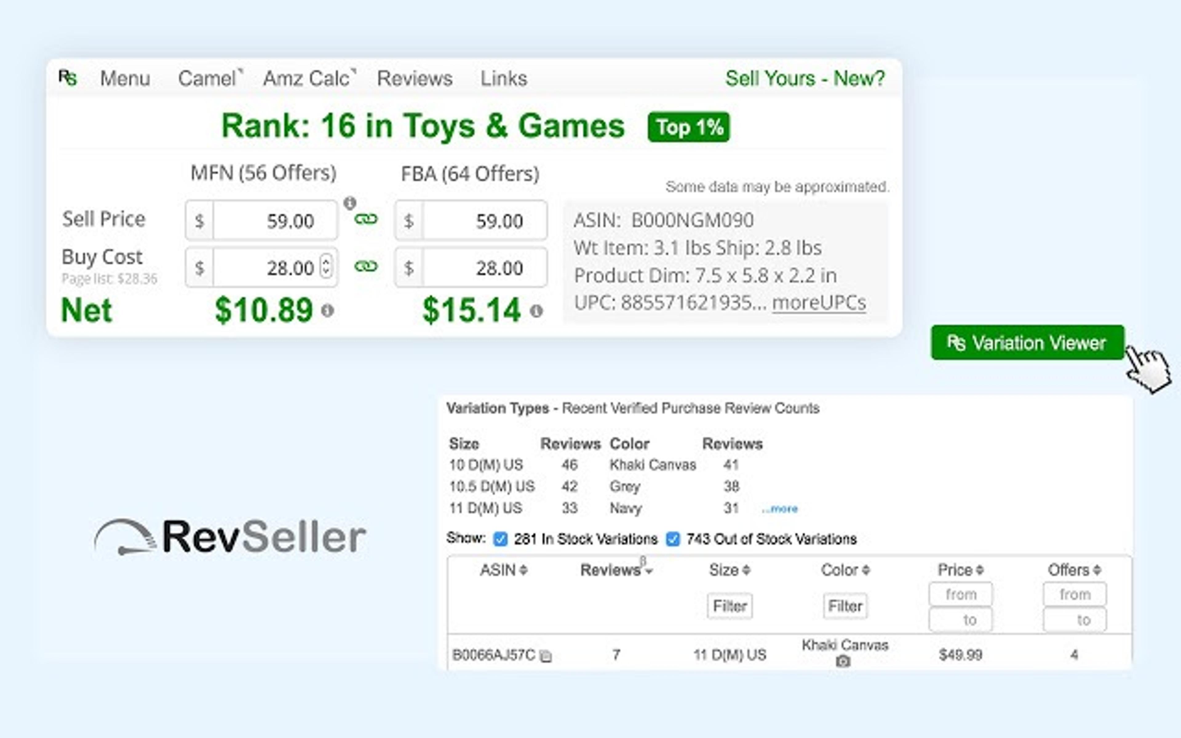 RevSeller is one of our favorite Chrome extensions. Its user-friendly interface allows you to calculate a listing's profitability in real time, while displaying only the essential data on the Amazon listing page. RevSeller will display both MFN and FBA offers side by side, allowing you to enter the cost for each fulfillment type on the fly. In addition to rapid profit calculations, RevSeller will also show product dimensions, sales rank, as well as ASIN and UPC codes.