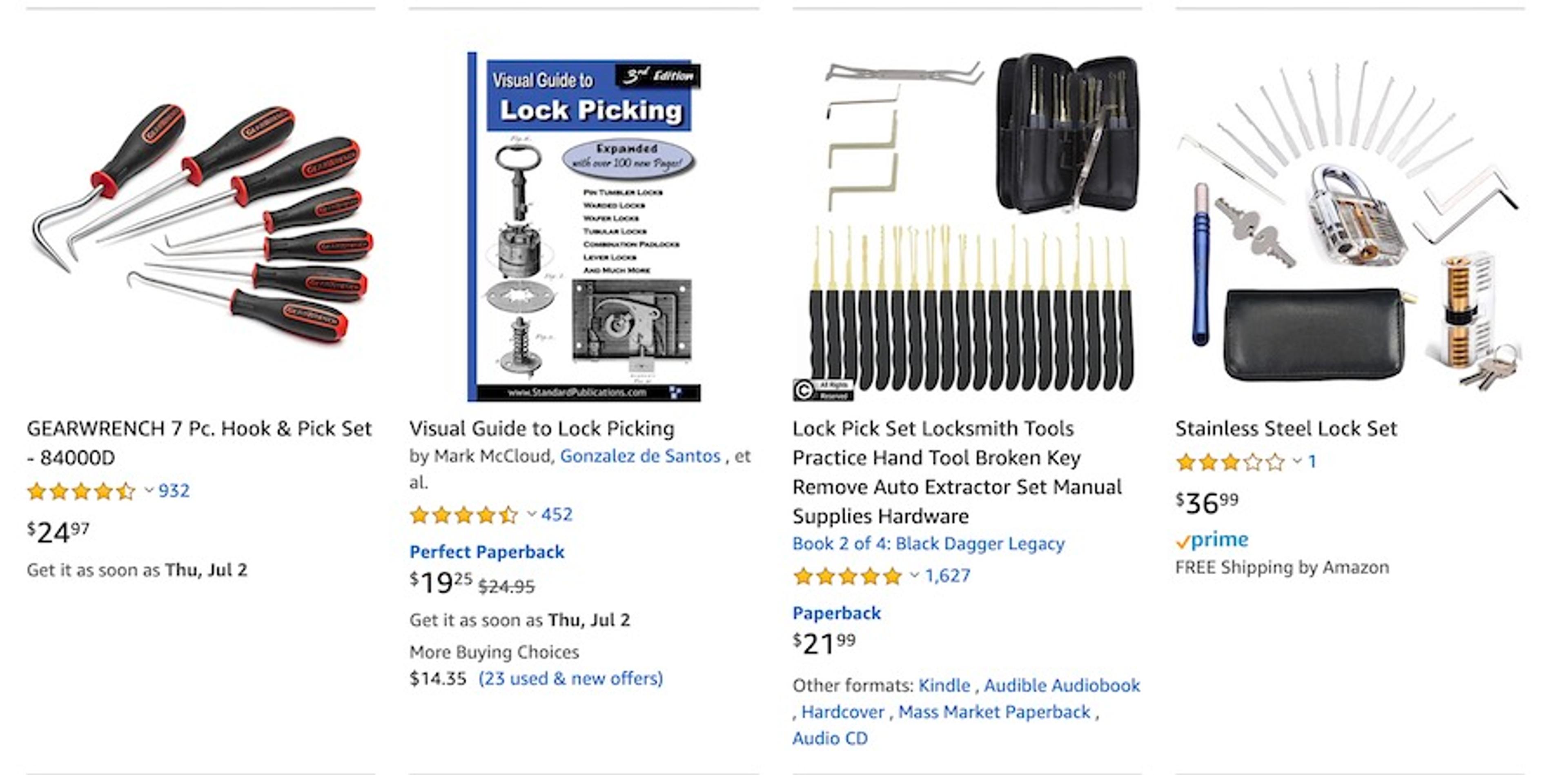 Lock Picking and Theft Devices are prohibited on Amazon. However, if you search for it on Amazon, there are results.