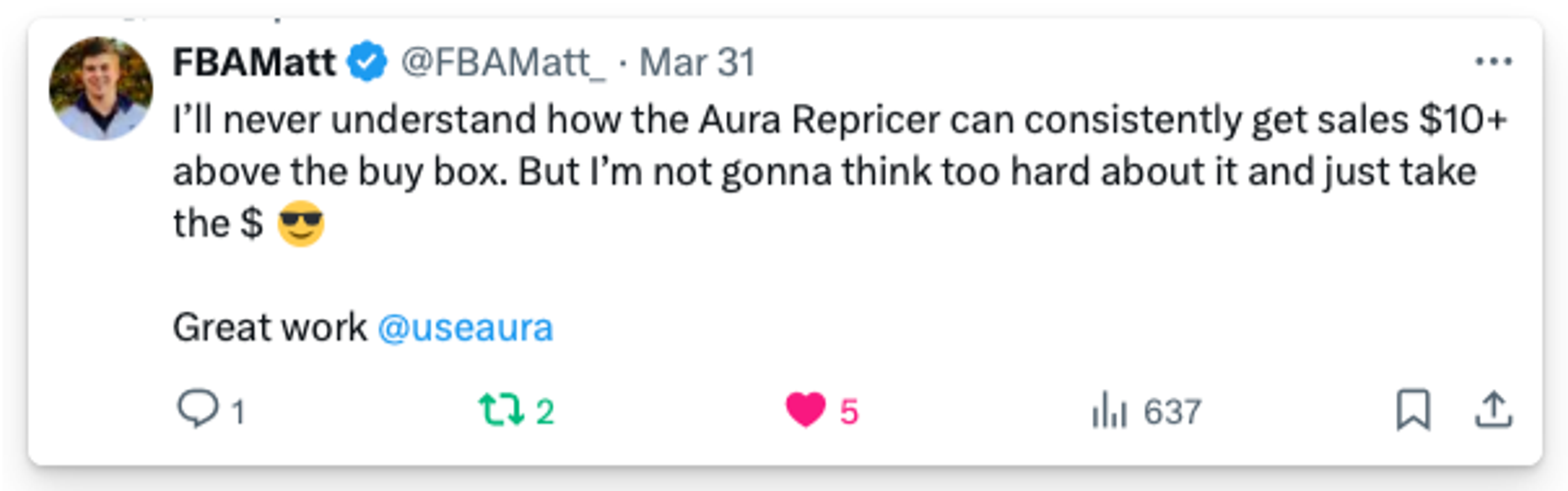 Aura is the Amazon repricing software we recommend to most Amazon sellers, and it's not particularly close.
