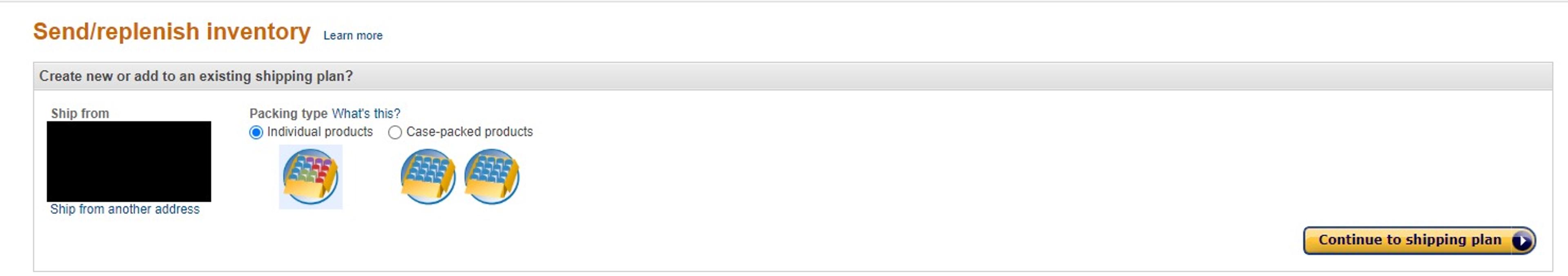 First confirm the “Ship from” address in the top left corner, adjust if necessary. Remember if your manufacturer is sending the products directly from their warehouse to Amazon you must change the “ship from address” to their address.