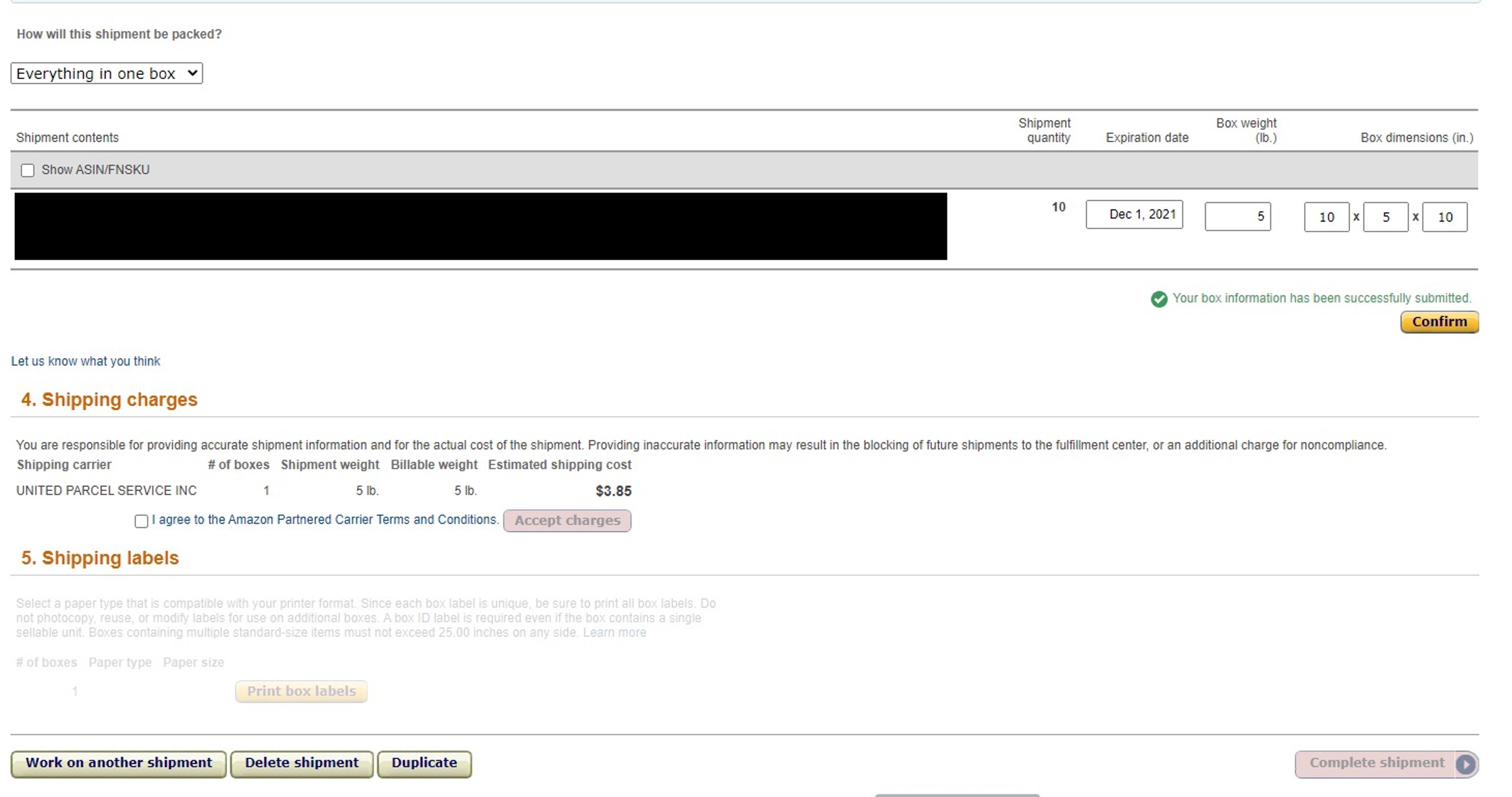 If you are shipping packages in multiple boxes you will need to give Amazon more information about which items will be in which boxes. You can fill out this information in a web spreadsheet form or upload a packing list. If you chose not to, you can opt to pay an Amazon manual processing fee.