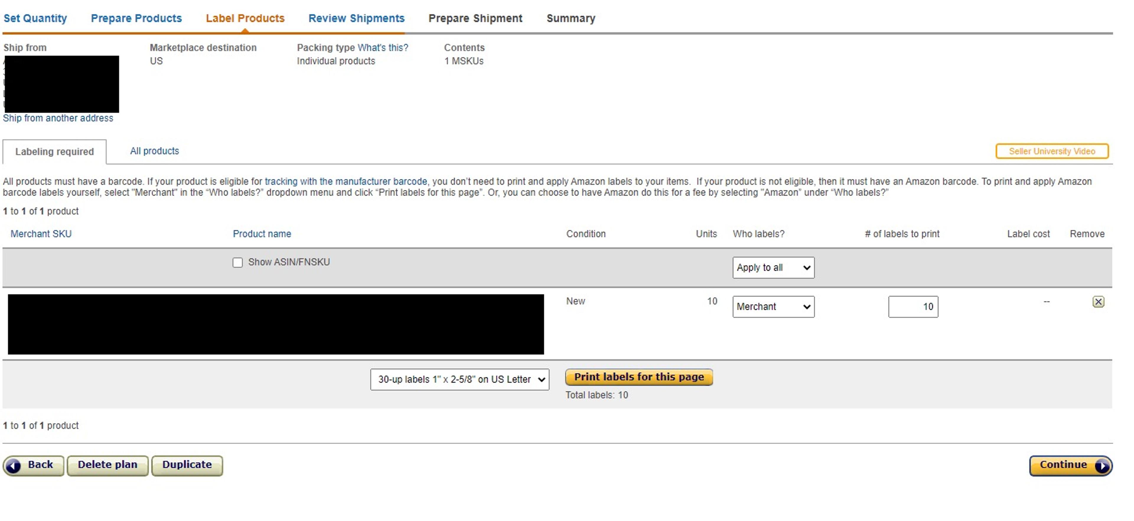 To access your labels and print them, select “work on shipment.” Then under the first section of the Prepare Shipment page, click on “Review and modify units.” Scroll down and you will then see the option to “Print Labels for this page.” If all your products were eligible with active UPC codes then you would be able to skip this step.
