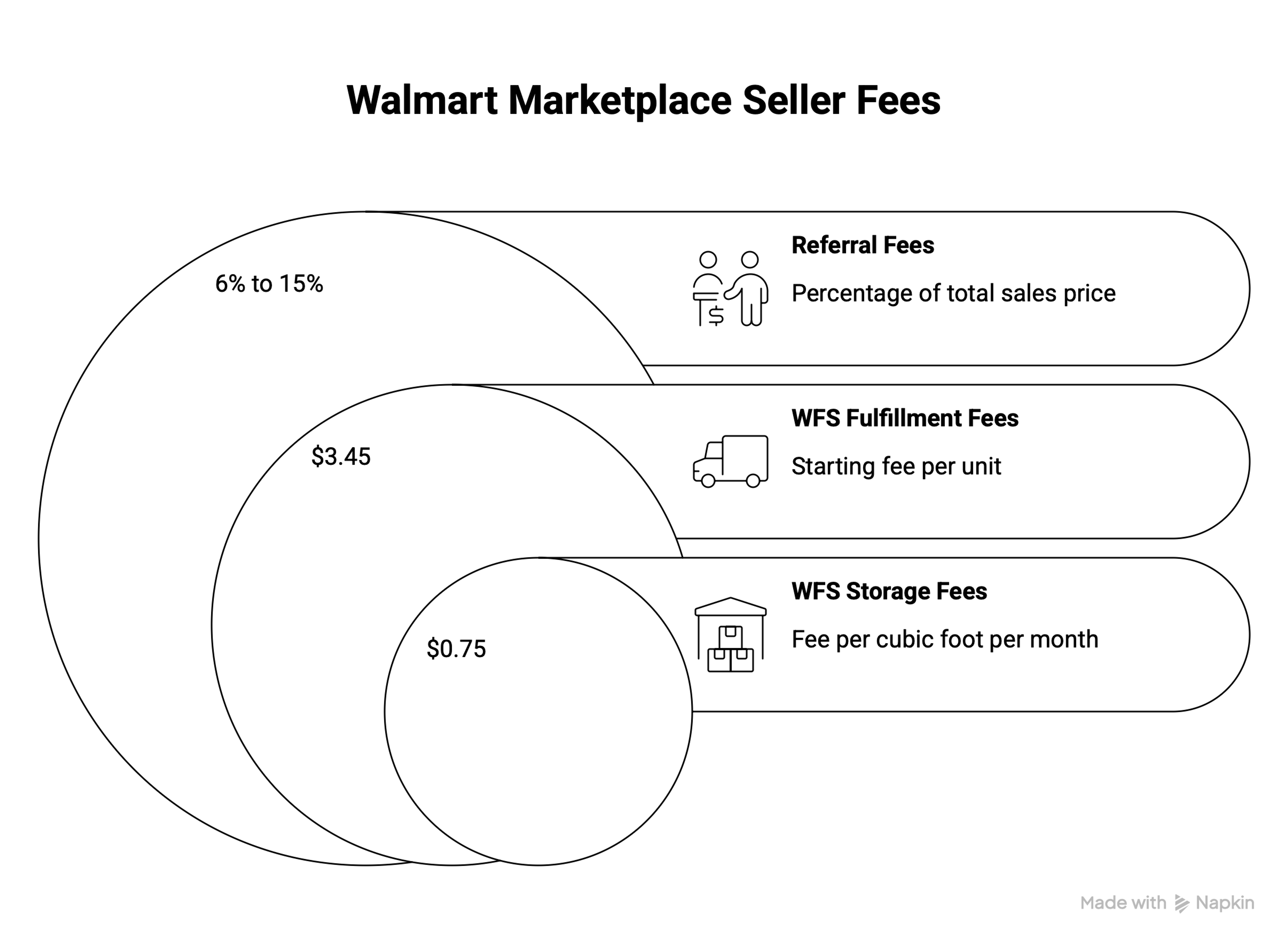 Here's the short version: Walmart charges no monthly subscription fees, no listing fees, and no item setup fees. You only pay referral fees of 6% to 15% per sale, and optional fulfillment fees if you use Walmart Fulfillment Services (WFS).