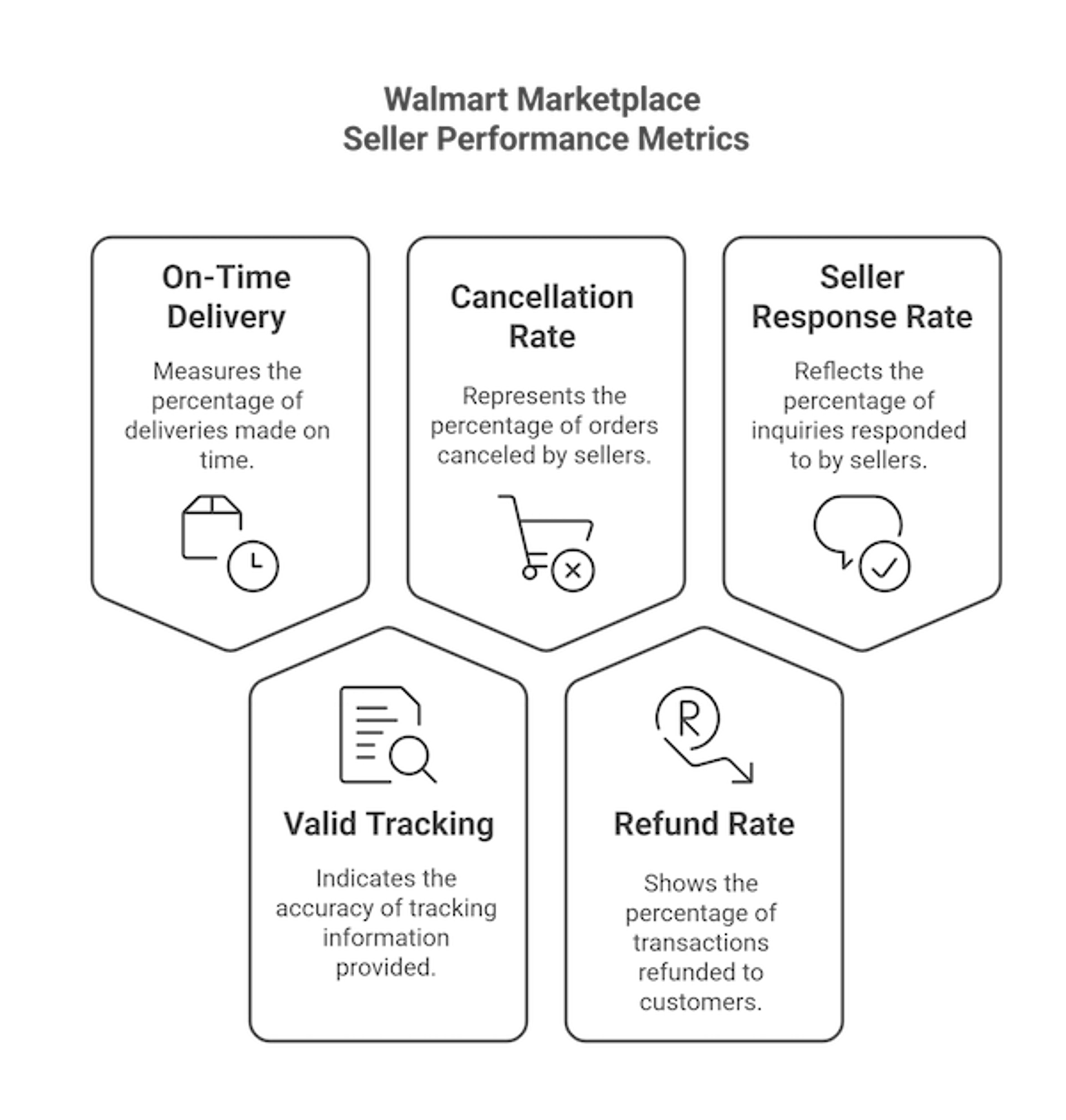 There are five key metrics that comprise Walmart's Seller Performance Standards. These metrics help ensure high-quality, consistent customer experiences on Walmart Marketplace. They are so critical that Walmart requires marketplace sellers to meet minimum qualifications for each of the five metrics: